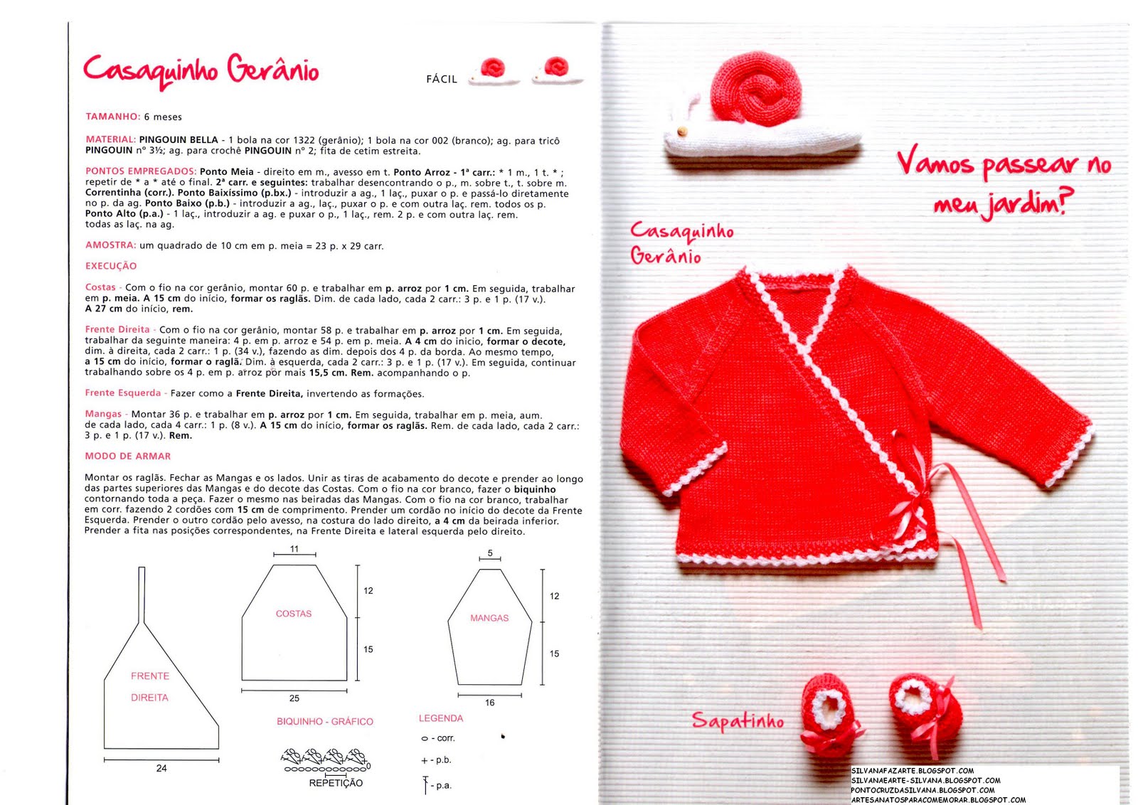 Começar pela solinha. Com o fio na cor gerânio, montar 38 p. e trabalhar em cordão de tricô da seguinte maneira: 1ª carr.: 1 t., 1 laç., 17 t., 1 laç., 2 t., 1 laç., 17 t., 1 laç., 1 t. 2ª , 4ª, 6ª e 8ª carr.: em t. 3ª carr.: 2 t., 1 laç., 17 t., 1 laç., 4 t., 1 laç., 17 t., 1 laç., 2 t. 5ª carr.: 3 t., 1 laç., 17 t., 1 laç., 6 t., 1 laç., 17 t., 1 laç., 3 t. 7ª carr.: 4 t., 1 laç., 17 t., 1 laç., 8 t., 1 laç., 17 t., 1 laç., 4 t. Trabalhar mais 10 carr. em t. 19ª carr.: 17 t., (2 p. juntos em t.) 10 v., 17 t. 20ª carr.:em t. 21ª carr.: 17 t., (2 p. juntos em t.) 5 v., 17 t. 22ª, 23ª e 24ª carr.: em t. Rem.