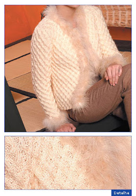 Costurar os ombros. Montar as mangas. Fechar os lados e as mangas. Costurar o marabu nos punhos, ao longo das frentes, decote frente e costas.